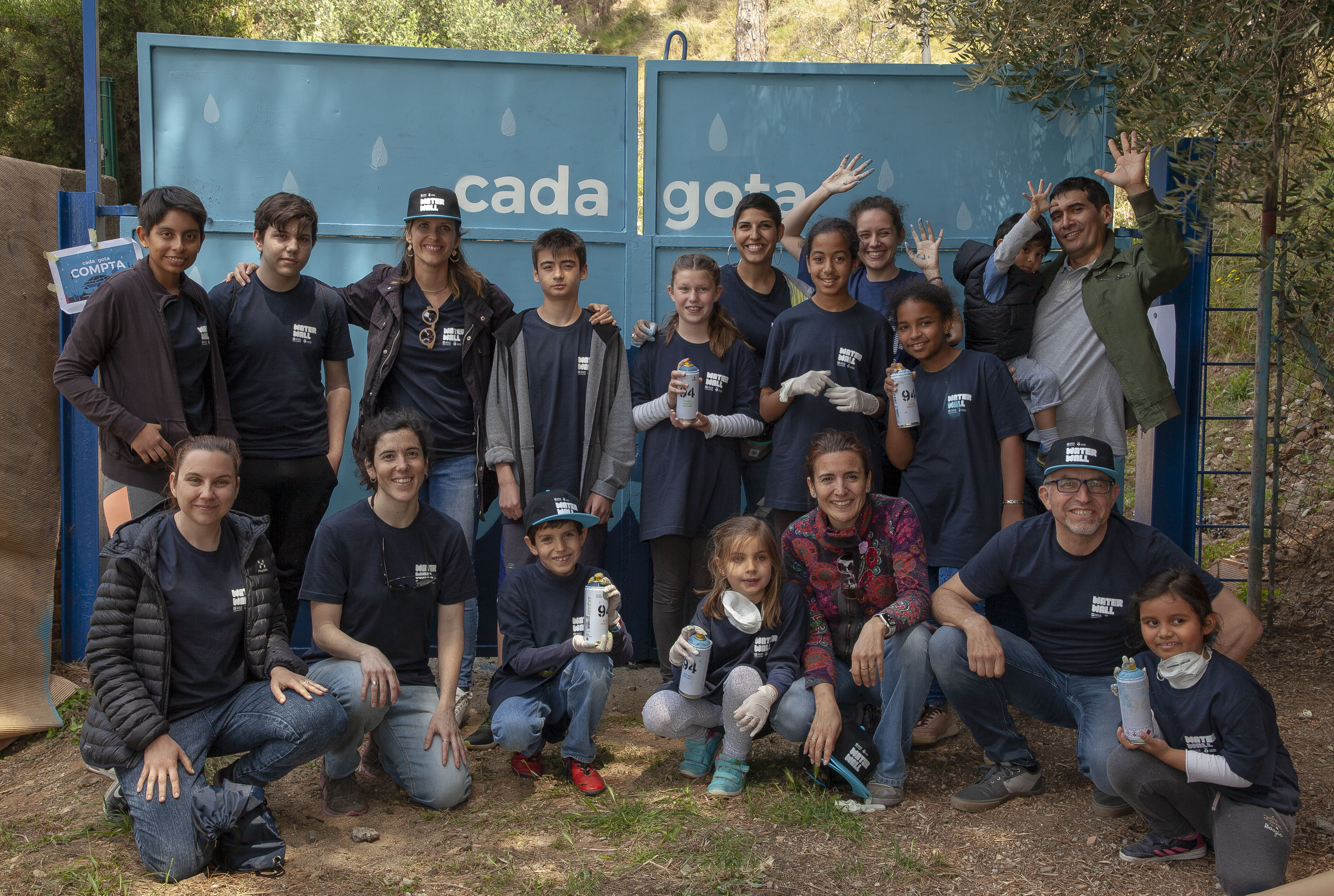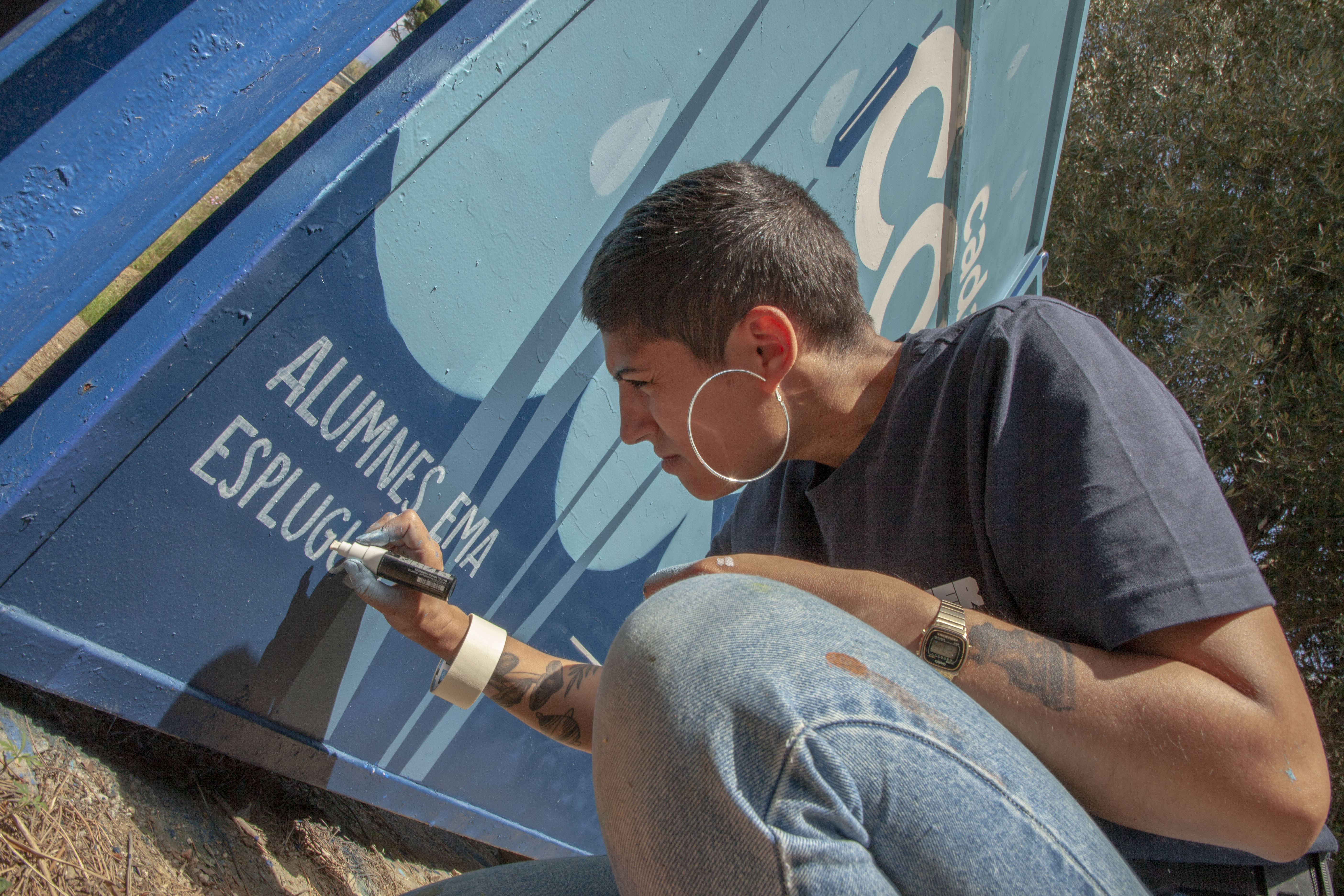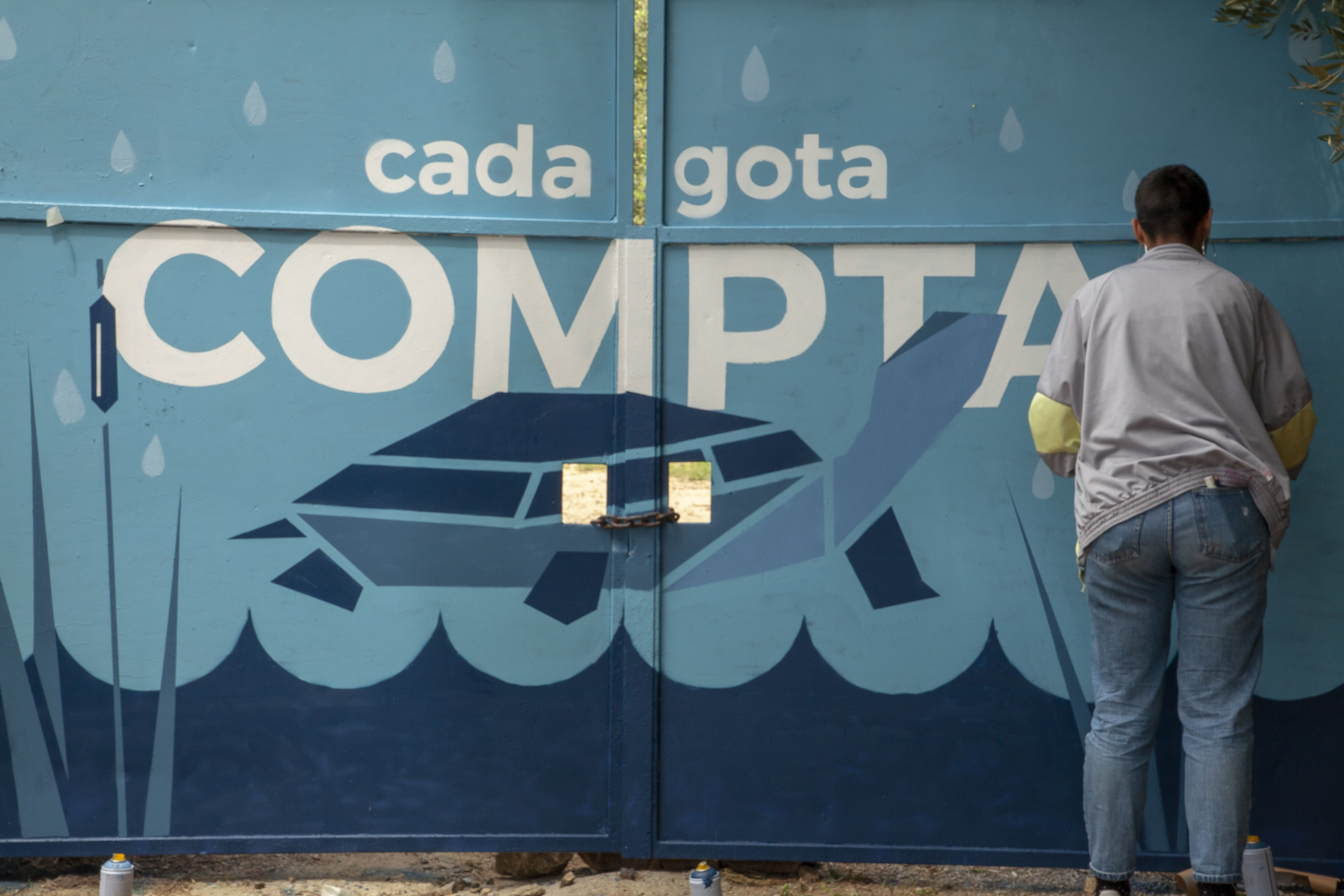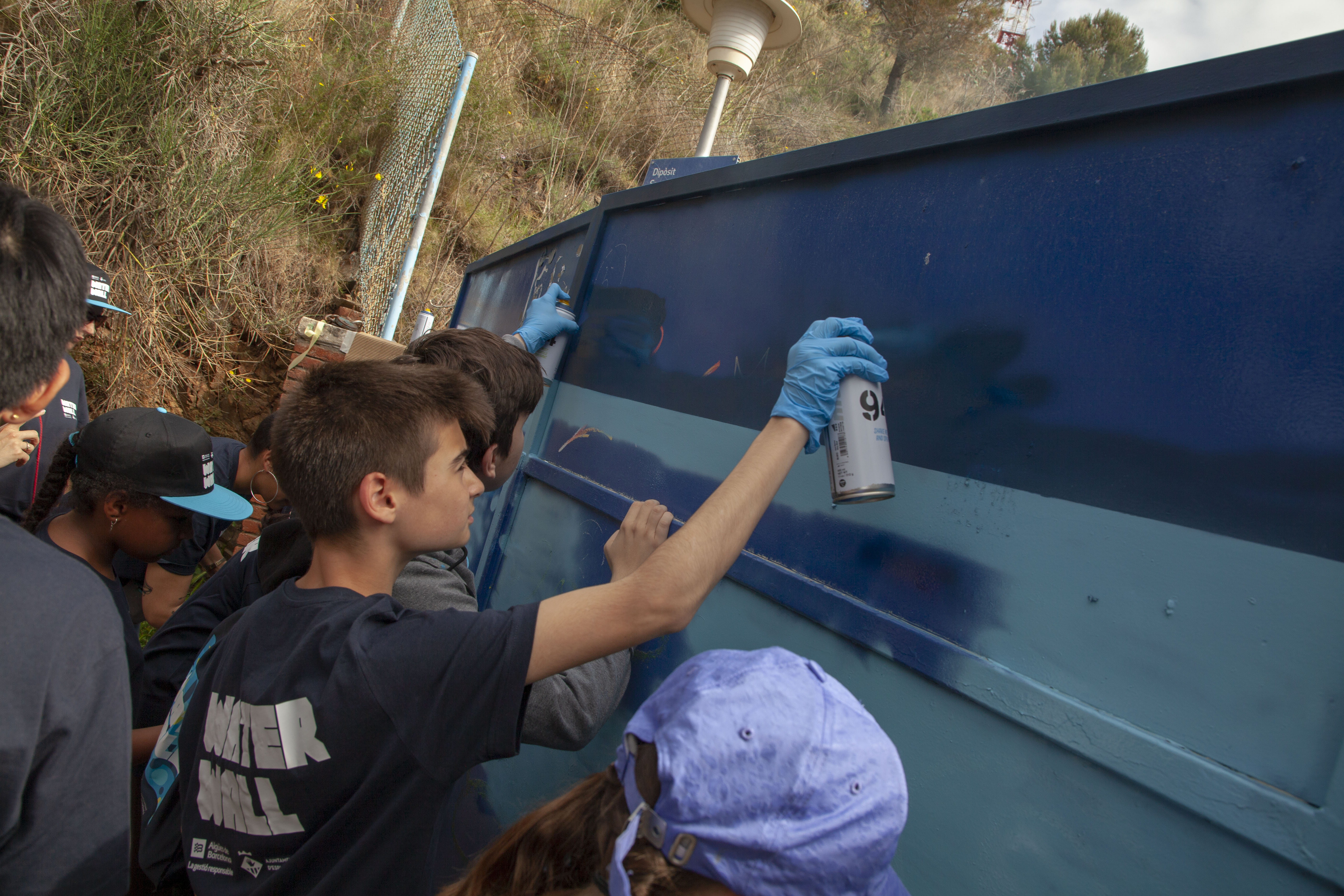 En les darreres setmanes, ha estat el jovent de l’escola d’art EMA —Espai Municipal de les Arts d’Esplugues— qui, juntament amb l’artista Núria Toll, ha pensat en com transmetre el missatge “Tot és aigua, cada gota compta” a les portes del dipòsit de Sant Pere Màrtir d’Esplugues. Gràcies a l’empenta i creativitat dels nens i nenes, l’acompanyament d’educadors en el procés de brainstorming i la plasmació final amb tècniques de grafiti o pintura amb esprai, el resultat és sorprenent.