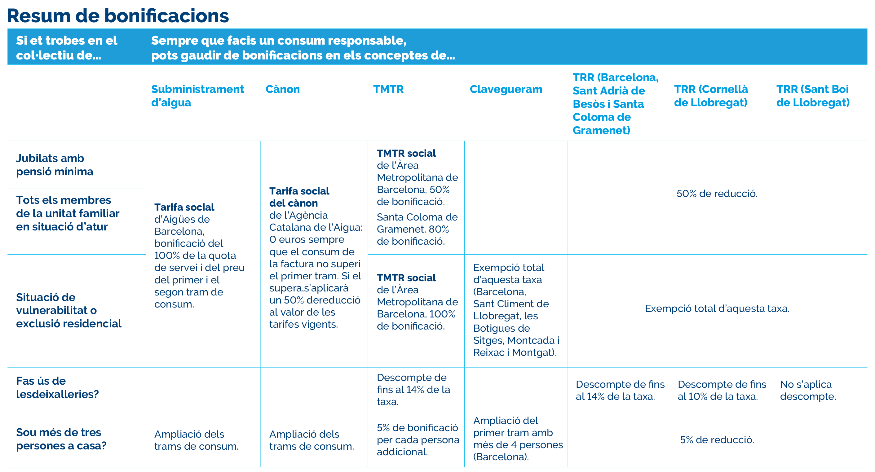 L’aigua és un bé públic, per això treballem perquè tothom hi tingui accés, fins i tot en les situacions més difícils. Descobreix com reduir l’import de la teva factura, com sol·licitar bonificacions o com —en cas de vulnerabilitat— convertir alguns conceptes de la factura en “socials” per gaudir sempre d’aigua a casa.